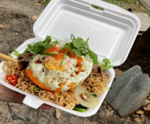 衛生観念ゼロ、30日使った後のようなドス黒い油で揚げた目玉焼きを乗せた、焼きそばが提供される。